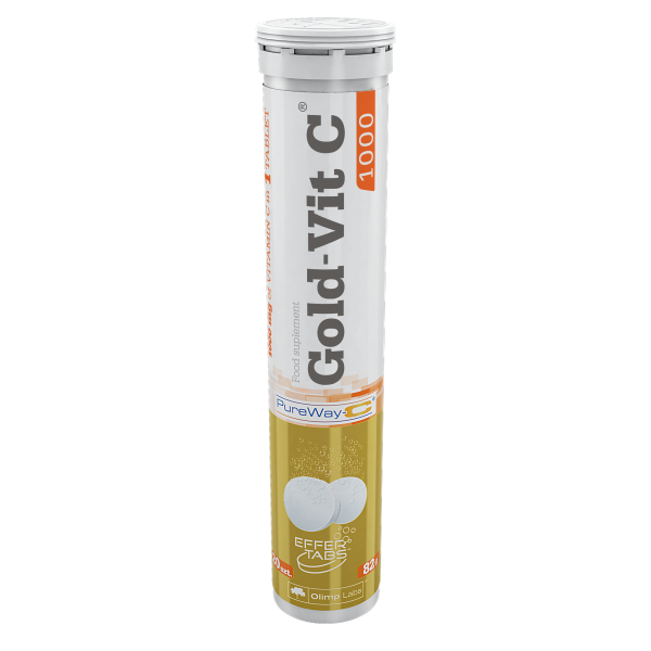 Το GOLD-Vit C 1000 είναι ένα συμπλήρωμα διατροφής σε μορφή αναβράζοντων δισκίων που περιέχουν υψηλή δόση νέας γενιάς PureWay-C® βιταμίνης C. Το PureWay-C® είναι μια κατοχυρωμένη με δίπλωμα ευρεσιτεχνίας μορφή βιταμίνης C – μικροκαψυλιωμένο σύμπλεγμα L-ασκορβικού οξέος και φυσικών φυτικών κεριών (μεταβολίτες του λίπους) – που είναι φιλικά στο στομάχι. Το προϊόν περιέχει γλυκαντικές ουσίες.