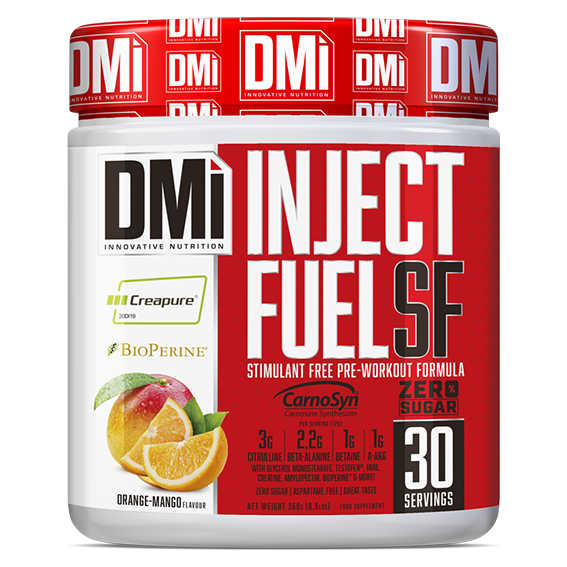 INJECT FUEL SF is an ultra-concentrated pre-workout formula totally free of stimulating ingredients based on Citrulline malate, Beta-Alanine (Carnosyn® Beta-Alanine), Glycerol monostearate, Creatine monohydrate (Creapure®), Betaine anhydrous, Arginine AKG , HMB, Fenugreek extract (Testofen®), Amylopectin, Vitamin B3, Black pepper extract (Bioperine®) and Vitamin B6.